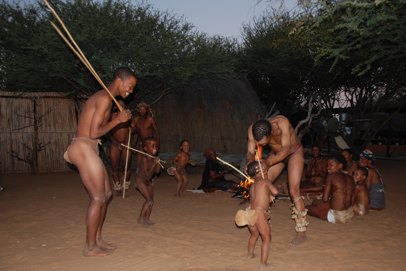Kurz vor Sonnenuntergang sind wir zurück im Dorf der San und versammeln uns um das Lagerfeuer. Neugierig beobachten wir das Treiben auf dem Dorfplatz: die Dorfältesten sitzen um das Feuer und rauchen; die anderen bereiten sich auf die traditionellen Tänze vor und holen Stöcke und Rasseln. Als es fast schon dunkel ist, fangen die San an um das Feuer zu tanzen. Alle machen mit – auch die ganz Kleinen, die sichtlich Spaß haben. Dabei beschwören sie mal den Regen, mal tanzen sie für eine gute Jagd und jagen symbolisch eine Antilope. Wir lauschen den Gesängen und Rasseln der San und freuen uns an ihrer lebensfrohen Art. Schließlich holen uns die San aus unseren bequemen Reifensesseln und wir tanzen alle zusammen um das Feuer.