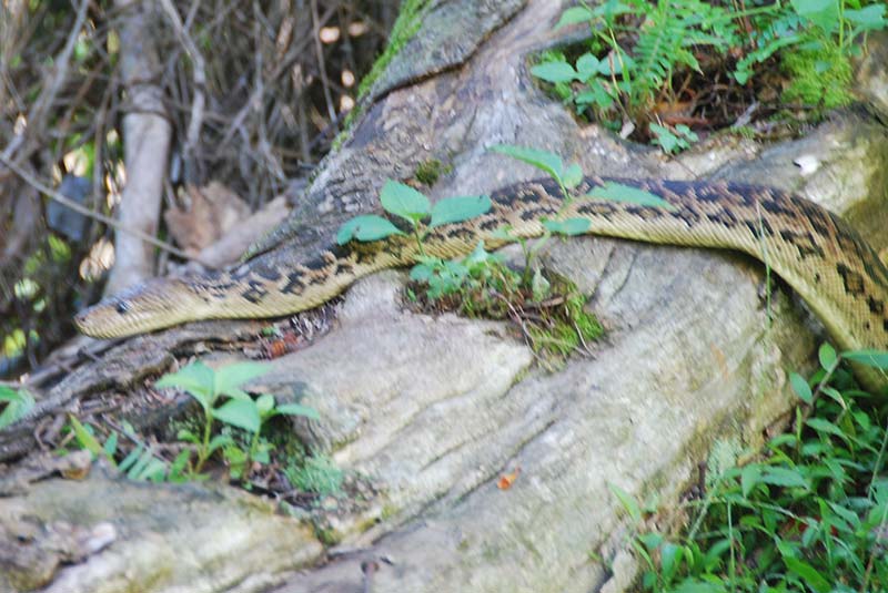 Der teils unebene Wanderweg führt uns als erstes auf ein Plateau, wo wir erneut die atemberaubende Aussicht auf die Sierra Maestra genießen dürfen. Dort sehen wir auch eine recht große Boa in freier Wildbahn, welche sich um einen Baumstamm schlängelt.